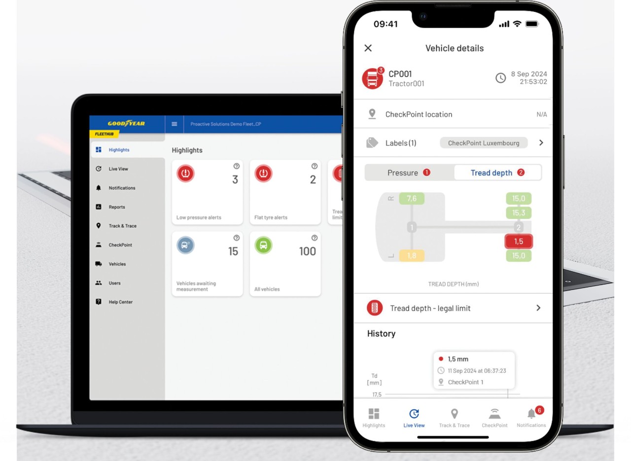 Goodyear CheckPoint ist ein vernetztes, auf dem Betriebshof installiertes Reifenprüfsystem, das während des Fahrens über eine Bodenplatte (Drive-Over Reader) den Reifenzustand und die Parameter des Fahrzeugs in Sekundenschnelle erfasst. Es automatisiert die Reifeninspektion für Fahrzeuge, die häufig auf den Betriebshof zurückkehren oder in der Werkstatt inspiziert werden. Die Lösung unterstützt Flotten und Serviceanbieter bei der Steigerung der betrieblichen Effizienz.